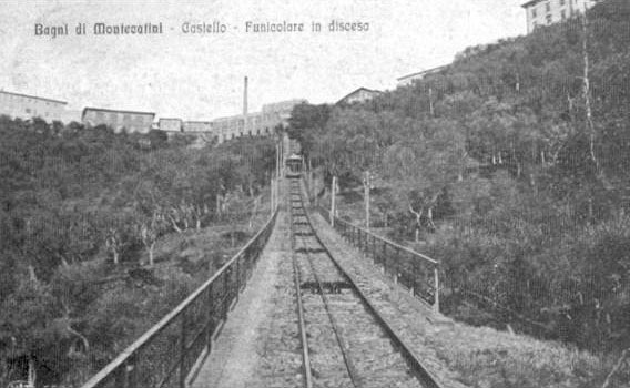 Inaugurata il 4 giugno 1898 alla presenza di illustri personaggi dell'epoca tra cui il maestro Giuseppe Verdi, la funicolare di Montecatini Terme conserva tutt'oggi gli originali vagoncini che si "salutano" come sempre a metà percorso. Tre scompartimenti, panche di legno e due balconcini per godersi il panorama straordinario, rimangono gli stessi immortalati in questa rara immagine del 1899: