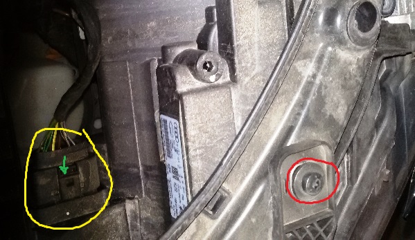 Per fare questo è sufficiente scollegare lo spinotto cerchiato in giallo facendo leggermente leva sulla linguetta indicata dalla freccia e svitare le due torx superiori (una è cerchiata in rosso nella foto, l'altra è facilmente individuabile) oltre ad allentare aiutandosi con una prolunga la torx di cui vi avevo parlato all'inizio: