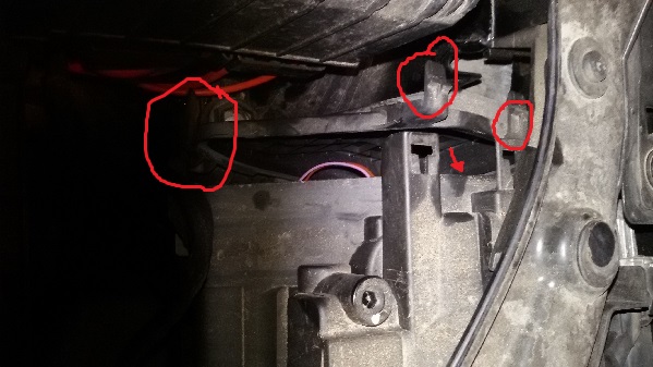 Per togliere il coperchio posteriore è sufficiente fare leva sulle 4 mollette in plastica cerchiate (una è un po' nascosta sull'esterno della vettura)