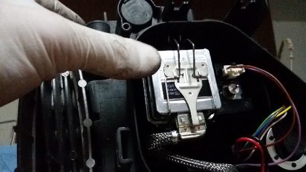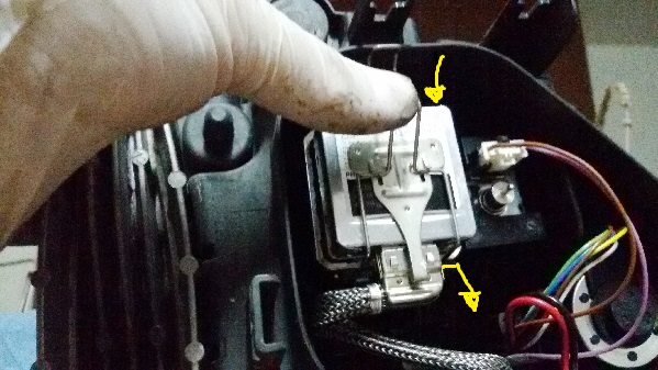 Tolto il coperchio questa è la situazione che vi trovate davanti (con la freccia rossa lo spinotto da estrarre e cerchiata in azzurro la molletta da spingere verso il basso per sganciarla):